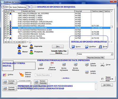 Adicionalmente la posibilidad de obtener información diversa para cualquier tarea que se presente en los procesos de atención y promoción, mostramos las principales opciones del control de la información de socios