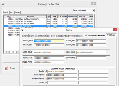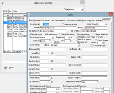 Desde una ventana se crean los Productos, se publican a sitios de Internet, ofreciendo diversas opciones a nuestros Socios y posibles nuevos prospectos, así como el muy diverso Control de la Cartera de Crédito, como cuentas de Orden, Prestamos Castigados y su recuperación.